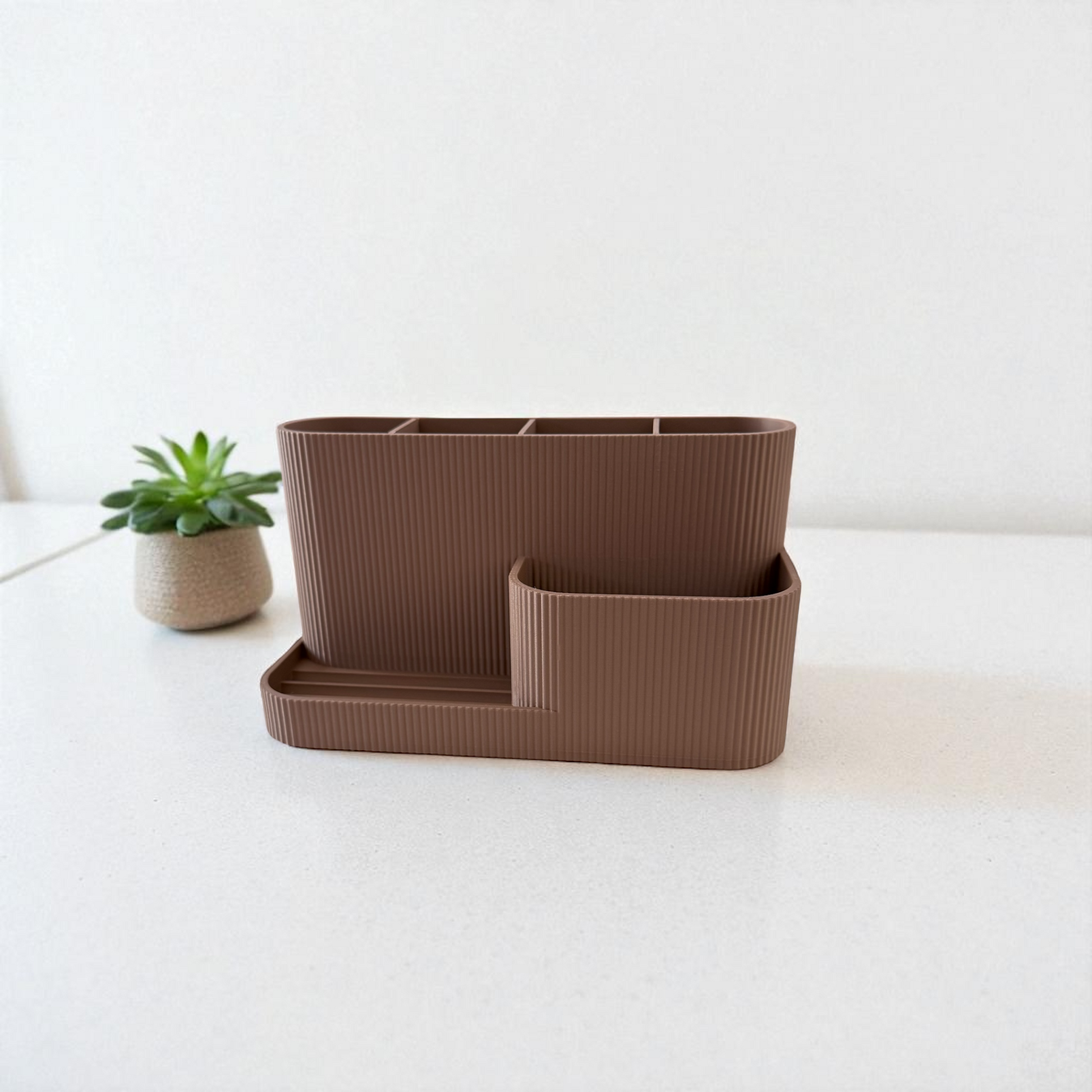Keep your workspace neat with this coffee hue desk organiser that includes a built-in phone stand. Crafted in the UK, it features a matte ribbed texture and offers four pen/pencil slots, a front storage area, and a dedicated phone stand section.