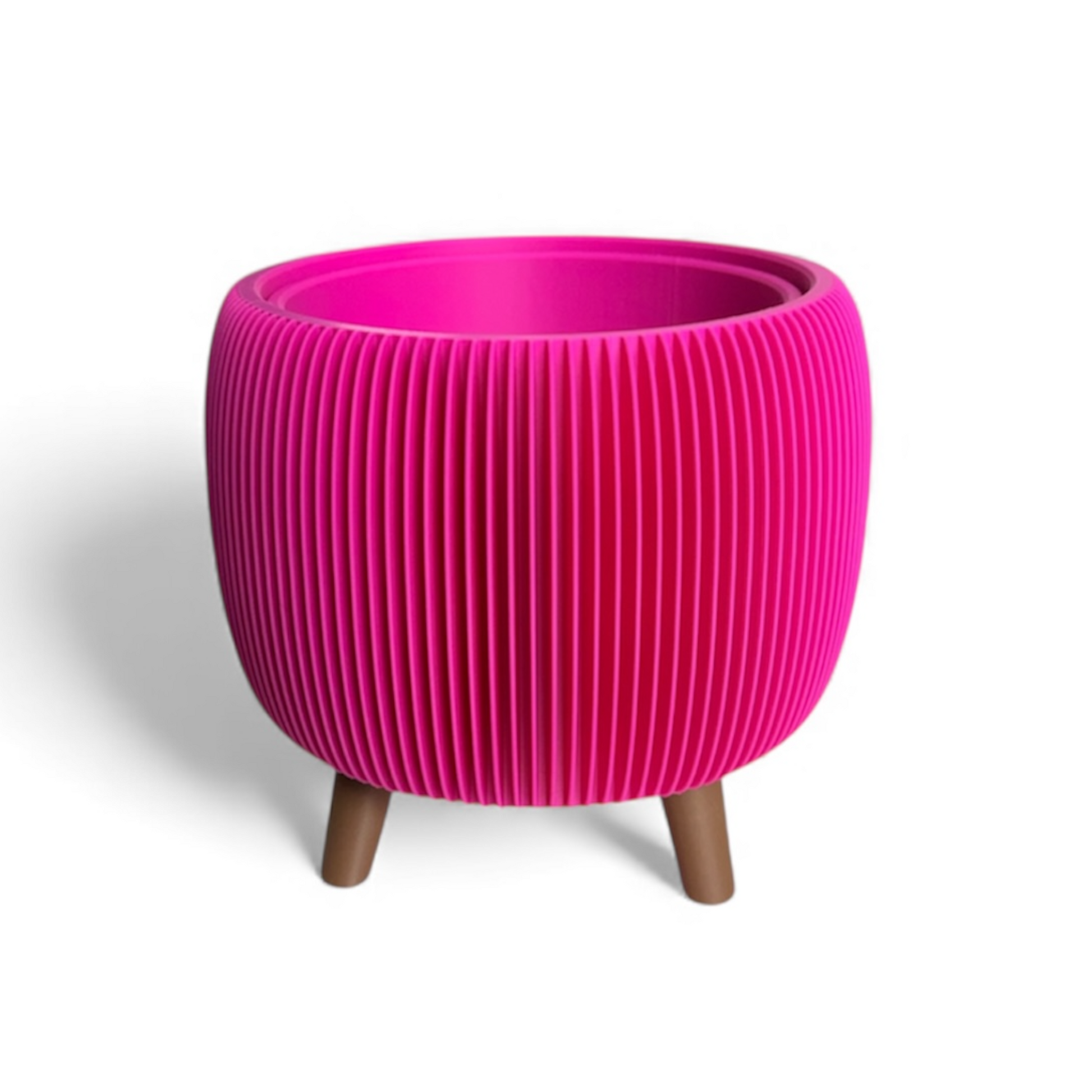 Showcase your indoor greenery with this Large Retro Ribbed Planter in Raspberry Satin. Its ribbed texture and raised feet add a stylish vintage touch. The included liner insert with drainage makes planting and maintenance straightforward, ensuring your plants thrive with ease. Perfect for adding a pop of colour and retro charm to any space. Made in the UK